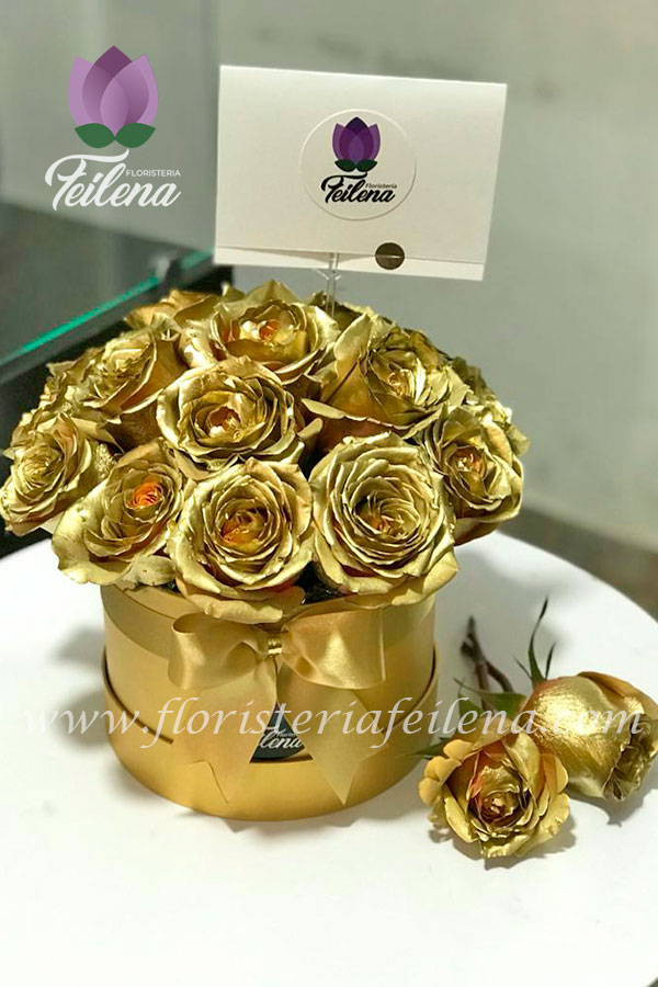 Hermosa caja de rosas doradas.
