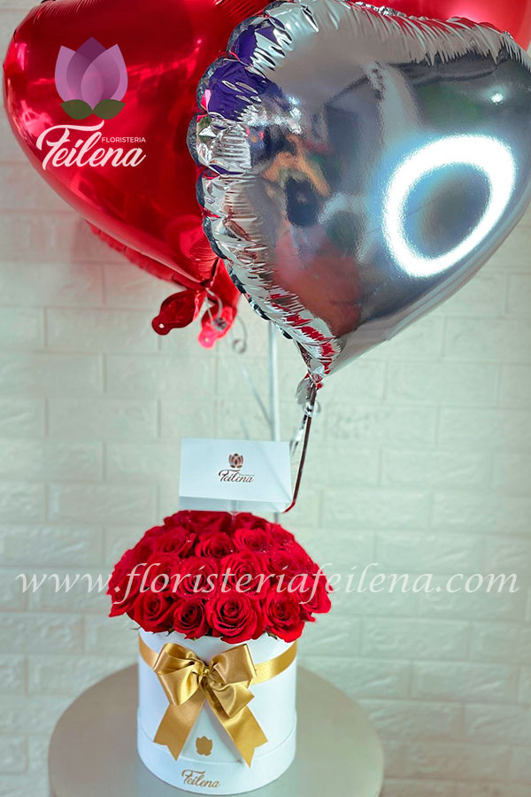Arreglo floral en forma redonda elaborado en rosas rojas, incluye globos en helio y tarjeta para la ocasión