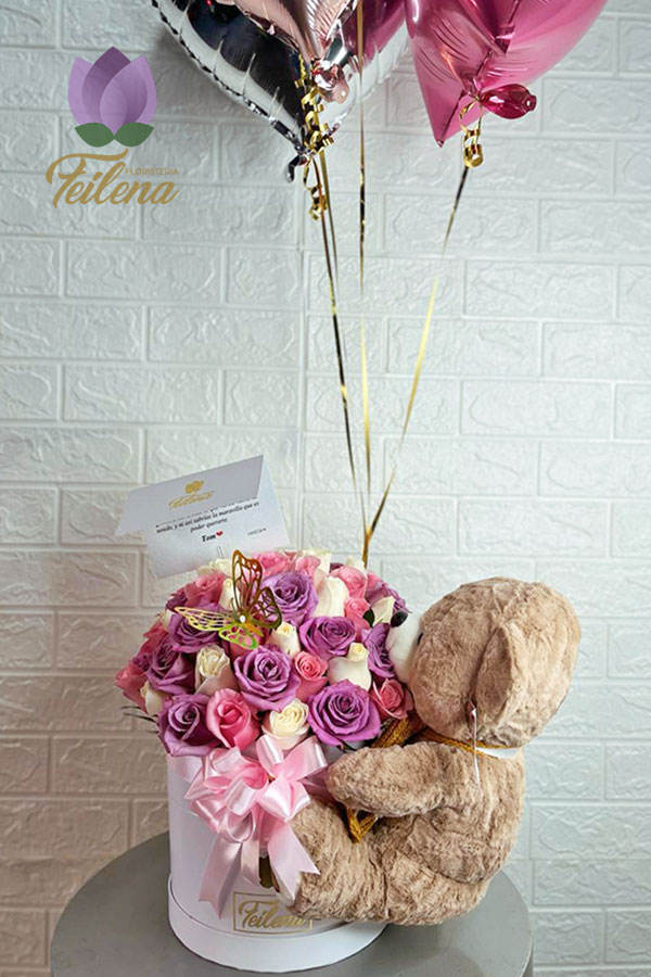 Caja de rosas con peluche