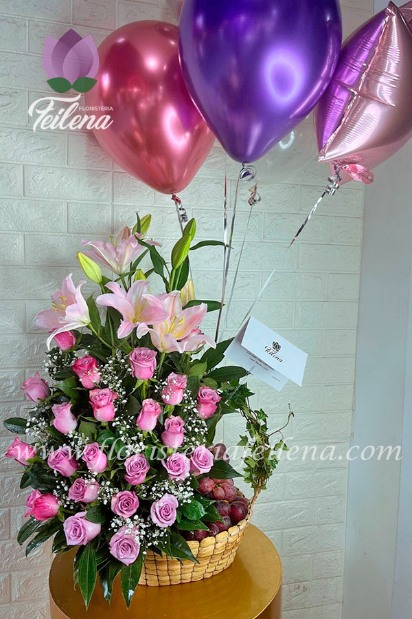Lindo frutero elaborado en rosas moraleche, incluye globos en helio y tarjeta para la ocasión.